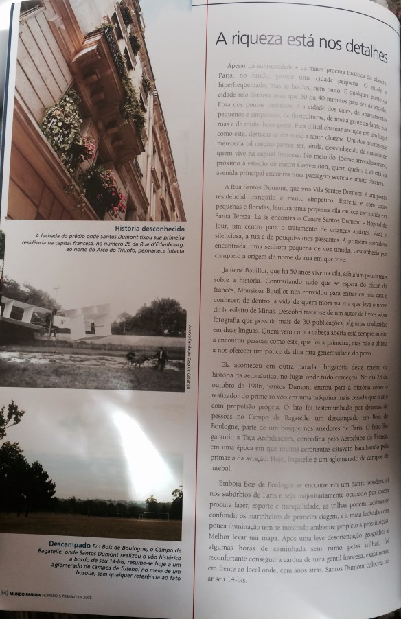 Entregue as últimas páginas do livro e ainda naquele mesmo ano do centenário do infame voo do 14-bis, fui a Paris. Era minha primeira vez. E fui pautada para escrever uma matéria sobre a data do 23 de outubro. Virou um roteiro de viagem à Paris do petit Santôs. Texto e imagens contrapunham a cidade de então com a de hoje, de maneira biográfica. O Campo de Bagatelle; o Musée de l’Air et de l’Espace no Aéroport du Bourget – onde está a réplica do simpático aviãozinho e de outros modelos, como a Demoiselle –; a Villa Santos Dumont; o edifício onde ele viveu no 17ème arrondissement; o hotel atrás da Torre Eiffel, onde caiu com seu dirigível; a Maison Cartier, na Champs-Élysées, onde ainda residem amostras de uma edição limitada do relógio de pulso desenhado sob encomenda pela grife para o aviador. O primeiro relógio de pulso da história. São muitas as histórias.